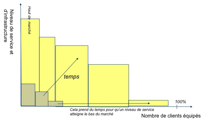 Il est donc indispensable de passer par des cycles opérant des allers-retours entre une offre encore partielle, chère, et l’adoption par les utilisateurs et clients, ce qui ne signifie pas une « acceptation » passive, comme nous l’avons vu, mais au contraire un apprentissage et une co-création des nouveaux produits et services. Le développement du marché a alors la forme de la la figure que nous avons déjà publiée: La dynamique de développement de marché. Des premiers services conquièrent le haut de marché. Puis des services plus sophistiqués réécrivent le marché pour ce segment, pendant que les services initiaux baissent de prix et atteignent un marché plus vaste. Cela continue en une série de cycles, jusqu’à atteindre éventuellement 100% du marché.